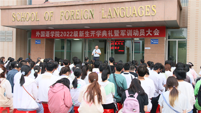 9月9日下午,外国语学院2022级新生开学典礼暨军训动员大会在外语楼门前举行,学院党政领导、系部主任、新生辅导员和全体新生参加,会议由院党委副书记姬惠惠主持。