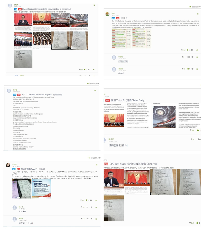 在《大学英语》教学中,陆厚祥老师在课前和课间环节播放中国国际电视台(CGTN)关于党的二十大盛会的英语新闻报道,在课后利用学习强国APP通过教学助理向全班同学及时推送有关二十大的最新英语时文。同学们在观看视频和自学推文的基础上认真摘抄热词、金句,并在学习通上发起图文并茂的讨论话题,课程空间呈现一派热烈的场景。