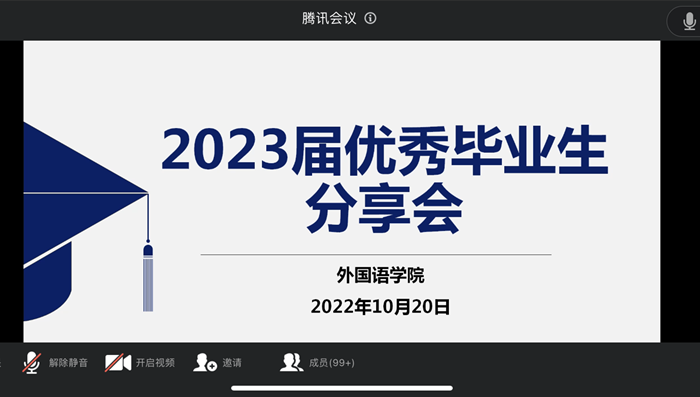 为帮助学生端正学习态度,提升综合素质和就业竞争力,充分发挥优秀毕业生的榜样作用,10月20日下午,外国语学院通过腾讯会议举办了2023届优秀毕业生线上分享会,学院各年级近200名同学参加了线上分享会。