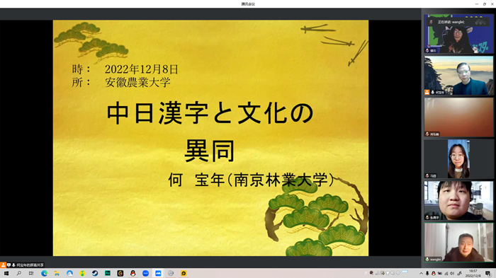 本网讯 12月8日晚,南京林业大学外国语学院教授、中国日语教学研究会江苏分会副会长何宝年教授应邀在线上为日语系师生带来了一场题为“中日汉字及文化的异同”的讲座。本次讲座为外国语学院日语系主办的“亚洲命运共同体”论坛系列讲座的第十四讲,日语专业20级全体学生及日语系部分教师聆听了讲座。