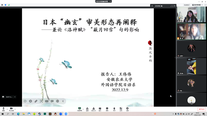 本网讯 12月9日晚,我校外国语学院日语系教师王伟伟为日语系学生进行了一场题为“日本‘幽玄’审美形态再阐释——兼论《洛神赋》‘蔽月回雪句’的影响”的线上讲座。本次讲座为外国语学院日语系主办的“亚洲命运共同体”论坛系列讲座的第十五讲,2020级日语专业全体学生聆听了讲座。
