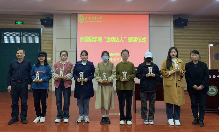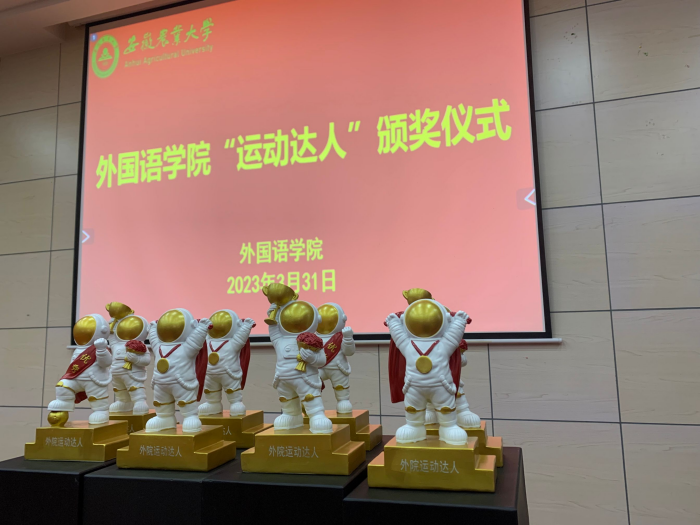 会上,学院领导为体测成绩达优秀的学生颁发了学院专门定制的“运动达人”奖杯。