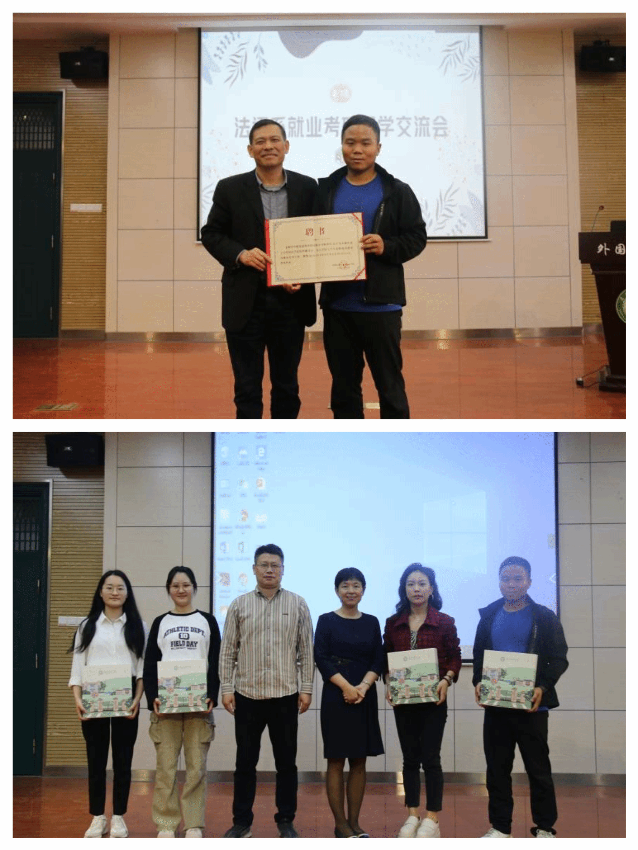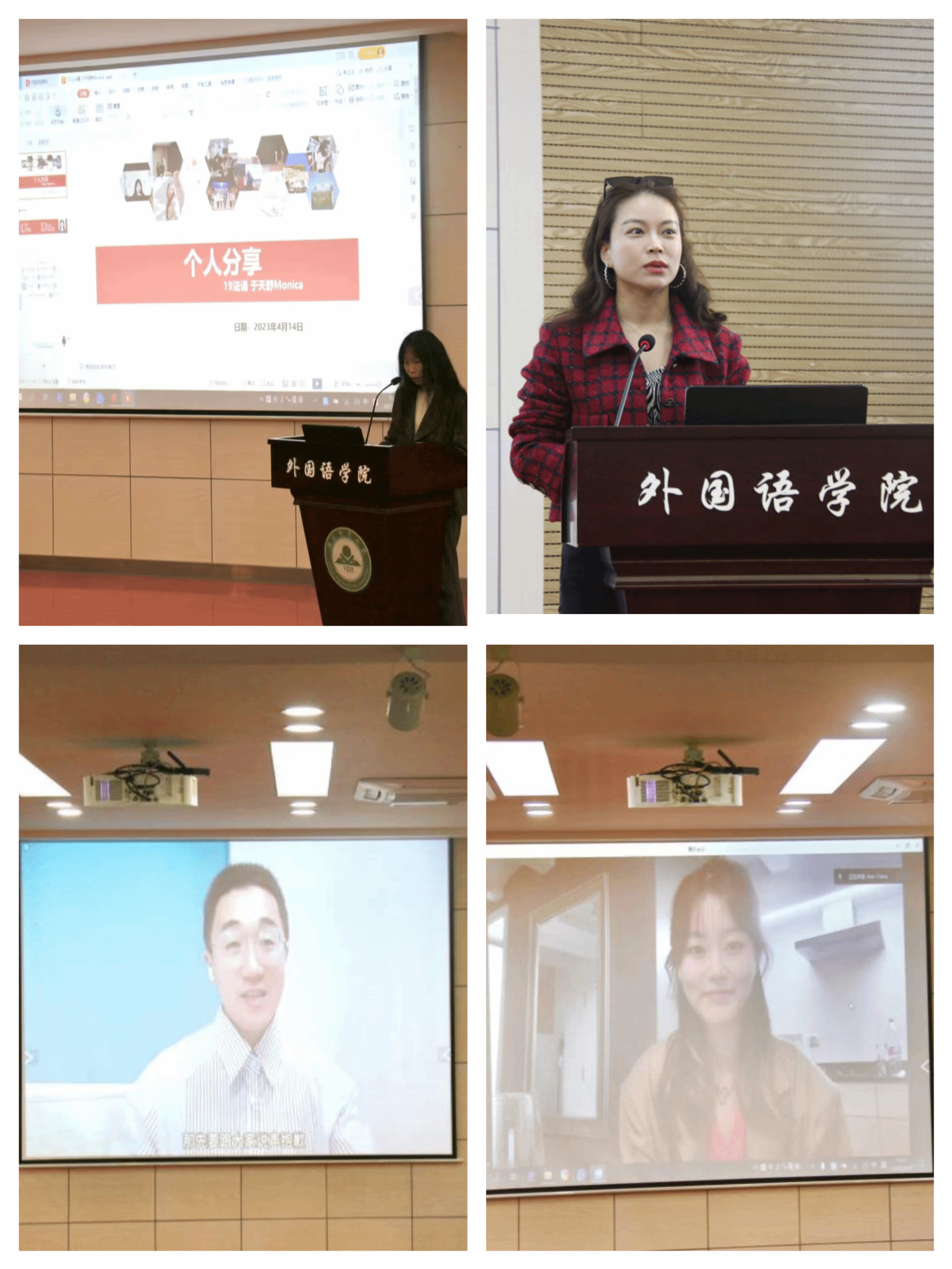 座谈会后,在学院502报告厅,校友们面向学院法语系全体在校生以线上线下相结合的形式开展了就业经历分享会。校友们依次分享了毕业后在就业、留学、考研等方面的经历和体会,并就在场学生的提问进行了耐心的解答。