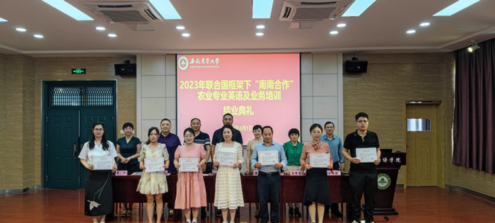 本网讯 6月1日下午,2023年联合国框架下“南南合作”农业专业英语及业务培训班结业典礼在安徽农业大学外国语学院502报告厅举行。省农业农村厅对外合作处处长韦艾平,一级调研员董曼薇、 陈正顺、宋秀兰,外国语学院党政领导方章东、姜红、姬惠惠、王玉明、许宗瑞,省农业农村厅办公室负责同志及全体培训教师和学员参加仪式。结业仪式由方章东主持。