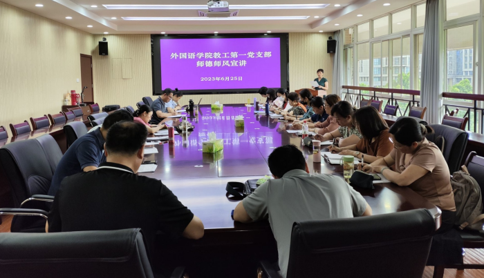 本网讯 6月25日下午,外国语学院教工第一党支部在学院506会议室开展学习贯彻习近平新时代中国特色社会主义思想主题教育暨师德师风宣讲活动,院长姜红及教工一支部全体党员参加。支部副书记张建荣主持此次宣讲活动。