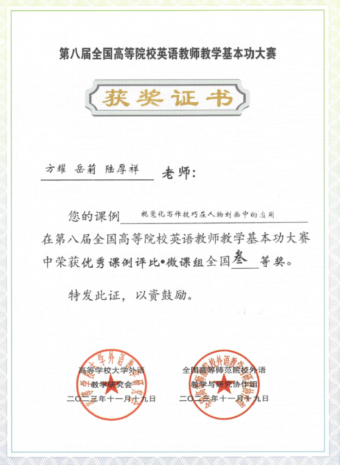 本网讯 11月16日至19日,“2023年全国高等院校英语教学学术年会暨第八届全国高等院校英语教师教学基本功大赛”在浙江杭州举办。在英语教师教学基本功大赛中,我院公共外语教学部方耀老师团队、岳莉老师团队分别获得微课组全国三等奖和实录课组省级二等奖,体现了我院教师在语言能力、知识储备、教学能力及数字化应用能力等方面的不断提升。