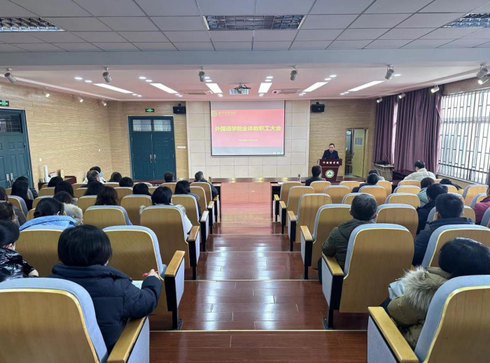 本网讯 12月26日下午,外国语学院全体教职工大会在外语楼502多功能报告厅举行。学院领导姬惠惠副书记、许宗瑞副院长、张文静副院长和全体教职员工参加了会议。会议由学院党委书记何如海主持。
