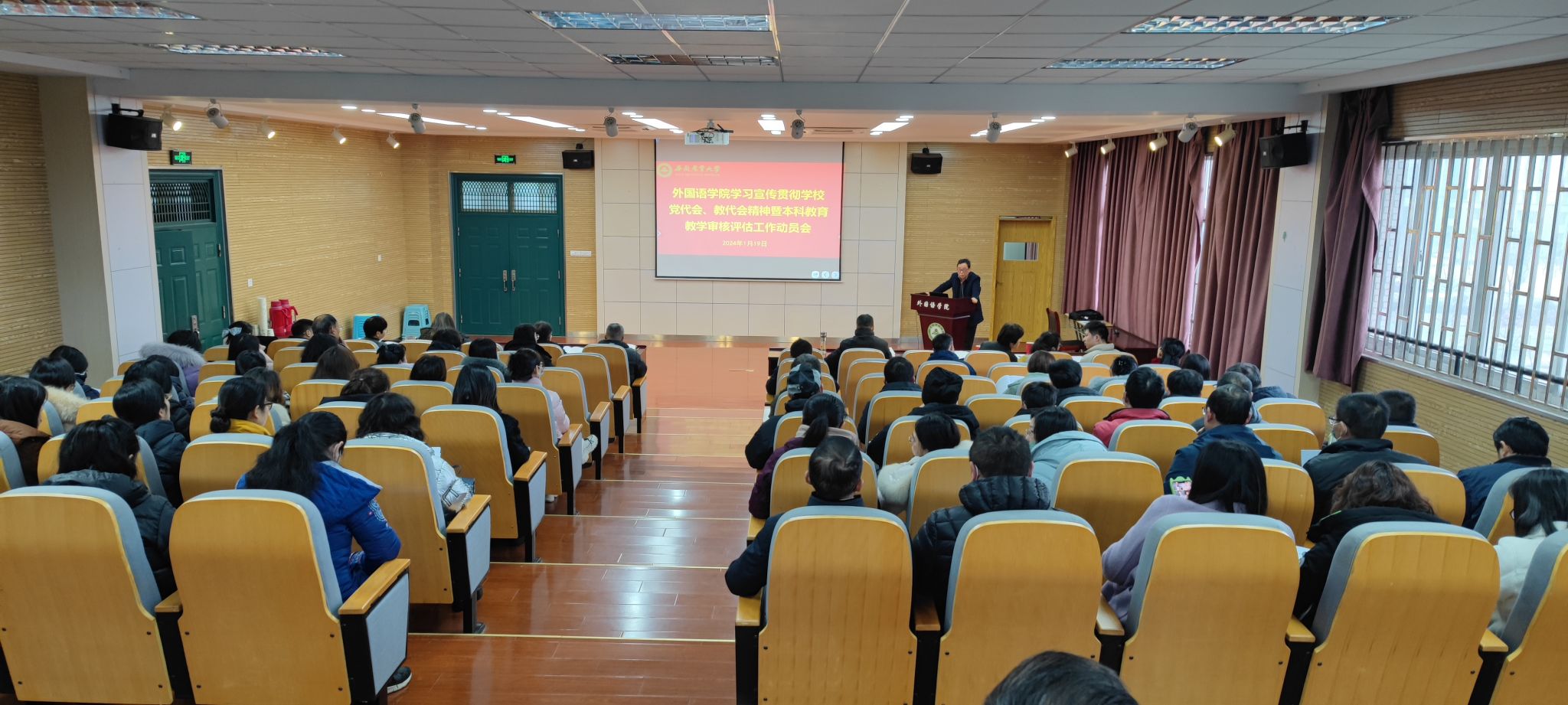本网讯 1月19日上午,外国语学院在外语楼502多功能报告厅举行学习宣传贯彻学校党代会、教代会精神暨本科教育教学审核评估工作动员会。学院领导姬惠惠副书记、许宗瑞副院长、张文静副院长和全体教职员工参加了会议。会议由学院党委书记何如海主持。