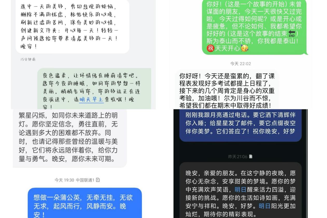 以美润心,温润心灵。5月20日—5月24日,学院举办“繁星点点祝福,晚安寄语暖心”晚安寄语活动,吸引学校近100名学生参加。学生匿名相互发送短信,短信内容包含鼓励的话语、美好的祝愿或简单的日常分享。活动既有助于缓解来自学习和生活的压力,也促进人与人之间的情感交流。
