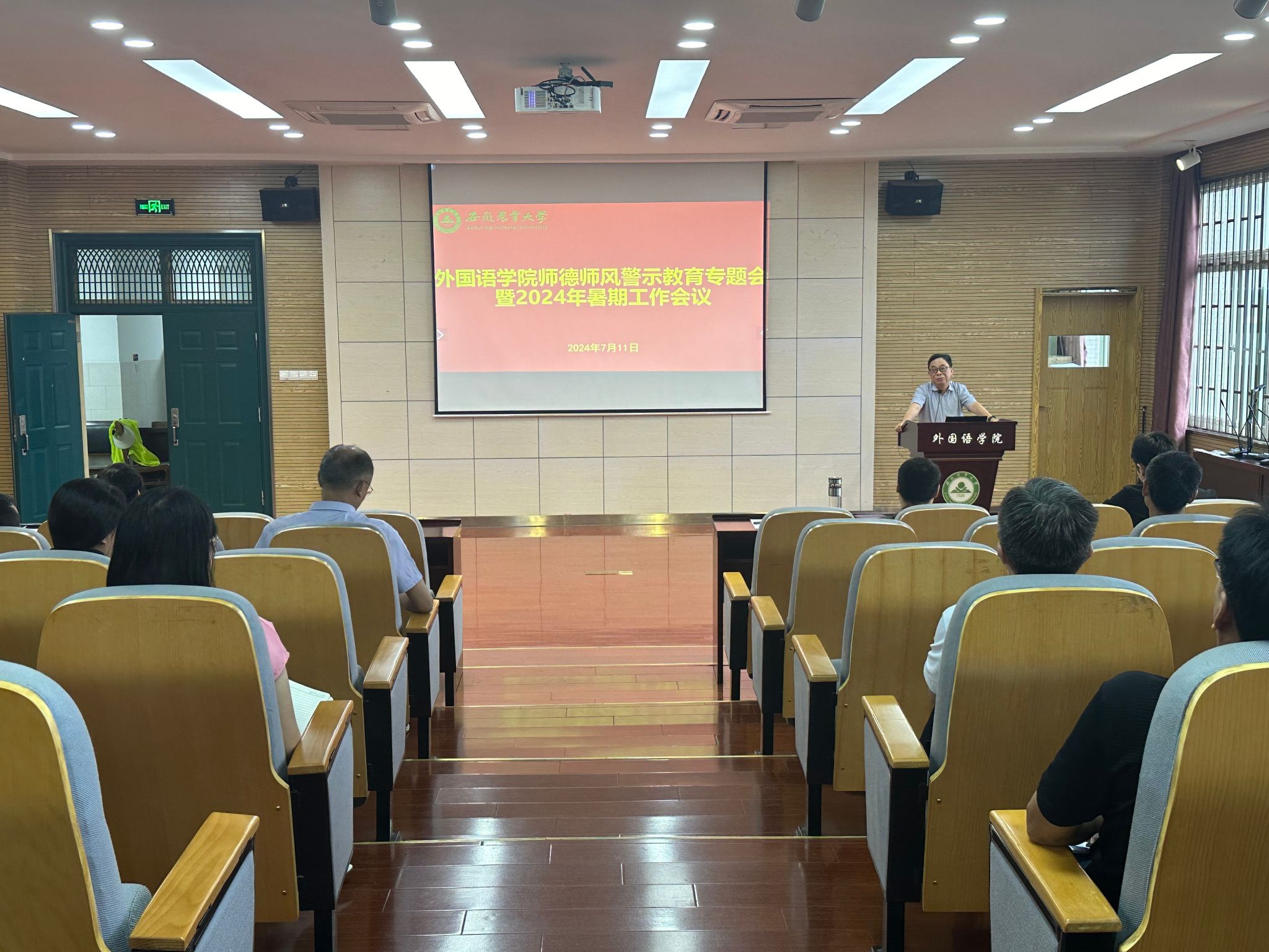 本网讯 7月11日上午,外国语学院在外语楼502多功能报告厅召开师德师风警示教育专题会暨2024年暑期工作会议。学院党委副书记姬惠惠、副院长许宗瑞、张文静和全体教职员工参加了会议。会议由学院党委书记何如海主持。