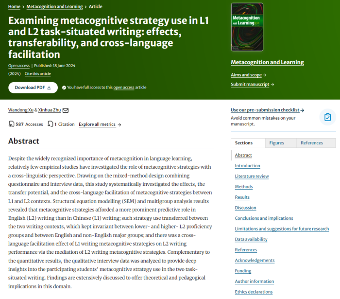 本网讯 近日,外国语学院英语系许皖栋博士在SSCI收录期刊《元认知与学习》(《Metacognition and Learning》)(5-year journal IF = 4.7,Q1)发表题为“母语和二语写作任务中元认知策略的使用:作用、可迁移性、和跨语言促进”(“Examining Metaconitive Strategy Use in L1 and L2 Task-situated Writing: Effects, Transferability, and Cross-language Facilitation”)的研究论文。