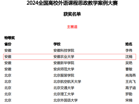 本网讯 近日,2024年全国高校外语课程思政教学案例大赛获奖名单公布,我校外国语学院参赛教师获得了优异成绩,其中沈楠老师获得特等奖,刘晓萍老师、岳莉老师获得一等奖。