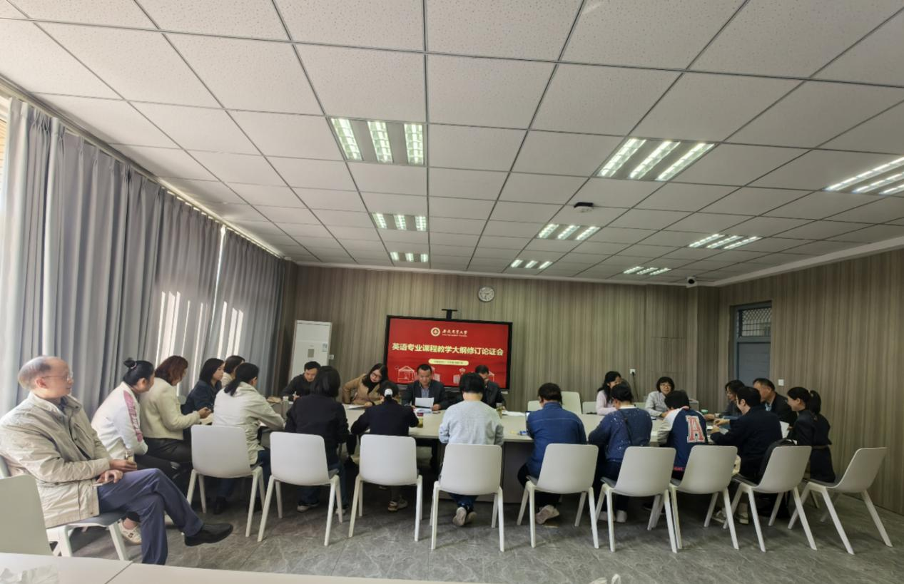 本网讯 为配合2024版本科人才培养方案的实施,全面提升人才培养质量,10月23日,英语系在405会议室召开了2024版英语专业课程教学大纲修订论证会。英语系主任刘成科主持会议,系部全体教师参加了会议。