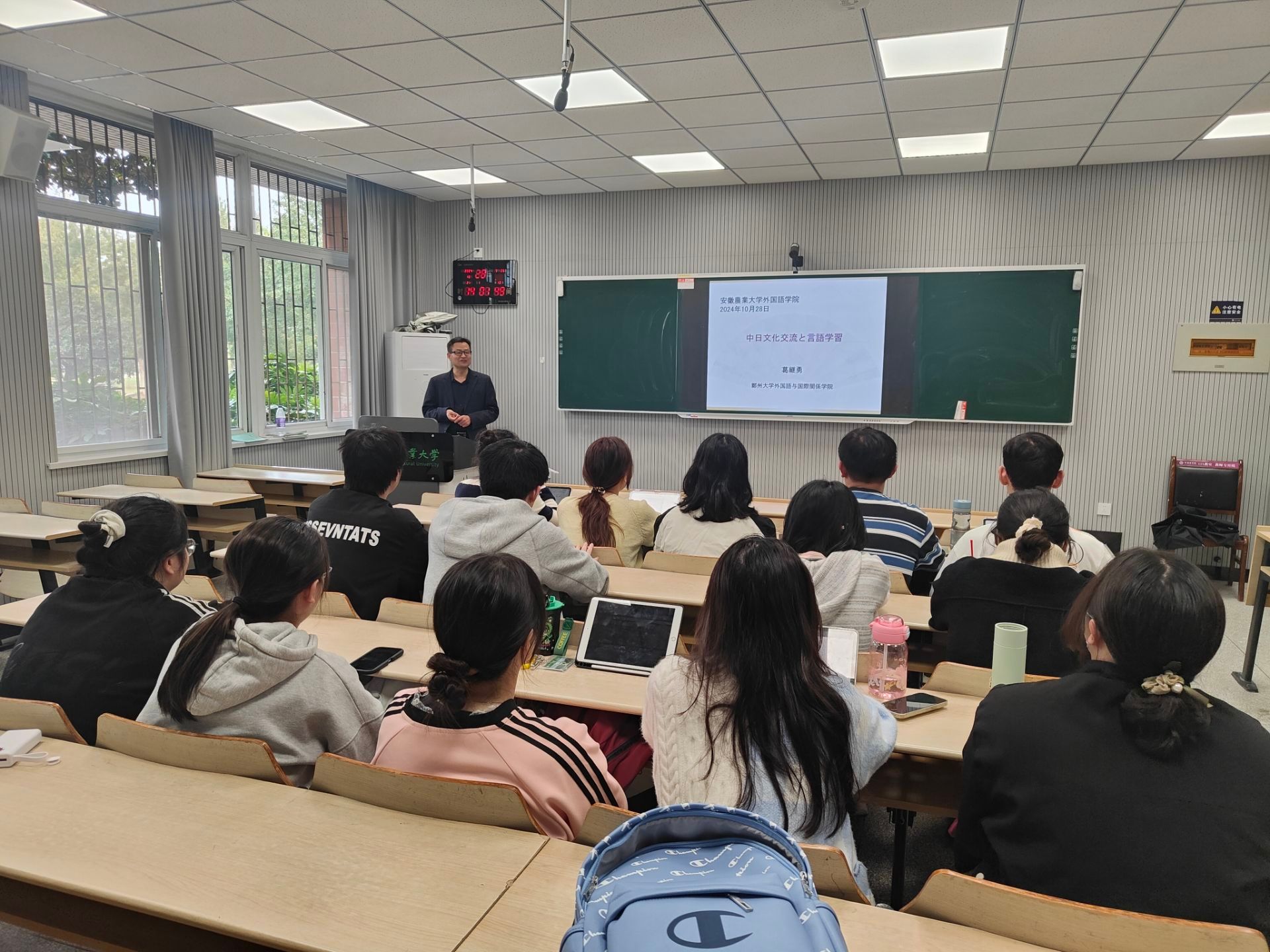 本网讯 10月28日下午,教育部高等学校外国语言文学类教学指导委员会日语分委员会委员、郑州大学亚太研究中心主任、亚洲研究院执行院长、博士生导师葛继勇教授应邀为我院日语系师生作了题为“中日文化交流和语言学习”的专题讲座。本场讲座为我院日语系主办的2024年度“亚洲命运共同体”系列学术讲座第八讲,日语系师生聆听了讲座。