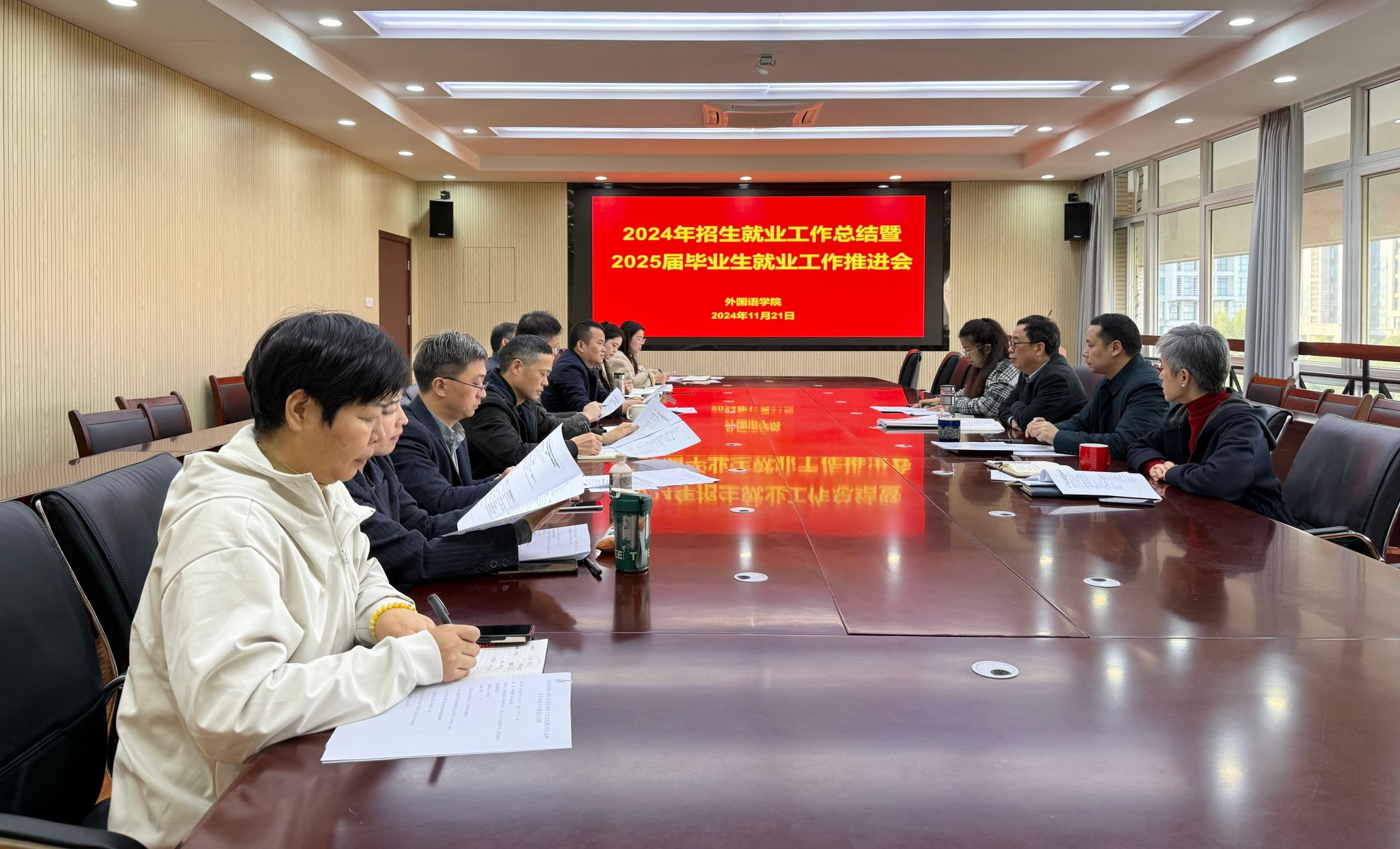 本网讯 为全面总结分析2024年招生就业工作,积极推进2025届毕业生就业工作,11月21日下午,外国语学院2024年招生就业工作总结暨2025届毕业生就业工作推进会在外语楼506会议室召开,学院领导、各系(部)主任、毕业班辅导员、教学秘书、就业联络员等参加了会议,会议由副院长许宗瑞主持。