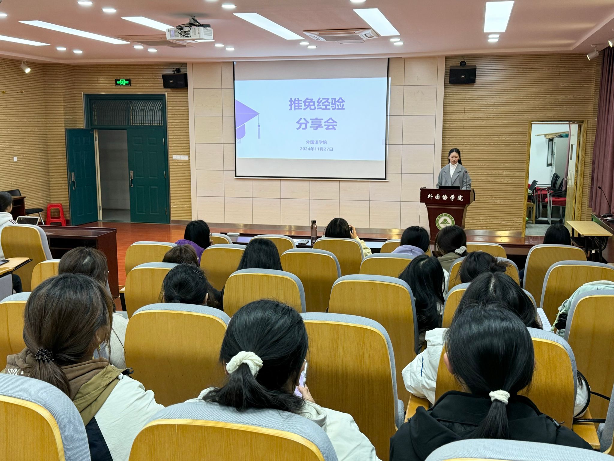 本网讯 为帮助学生了解推免政策,发挥榜样示范引领作用,激发学生学习积极性、主动性。11月27日晚,外国语学院在外语楼502报告厅举办了2025届优秀毕业生推免经验分享会,学院各年级部分同学参加了活动。