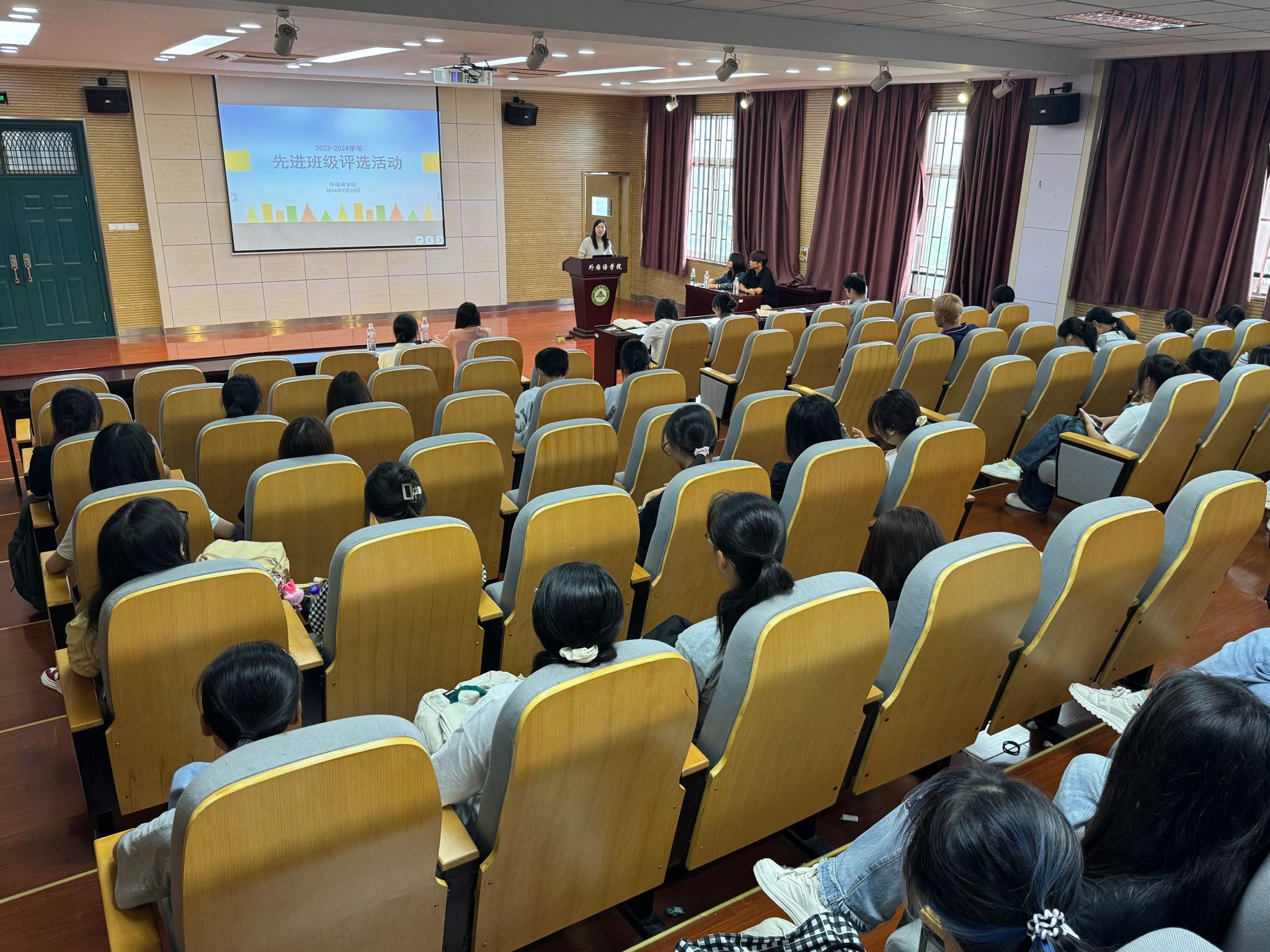 本网讯 为推进班级建设,弘扬优良学风,9月20日中午,外国语学院于外语楼502报告厅举行2023-2024学年“先进班级”评选汇报会,外国语学院团委老师出席本次报告会并担任评委。