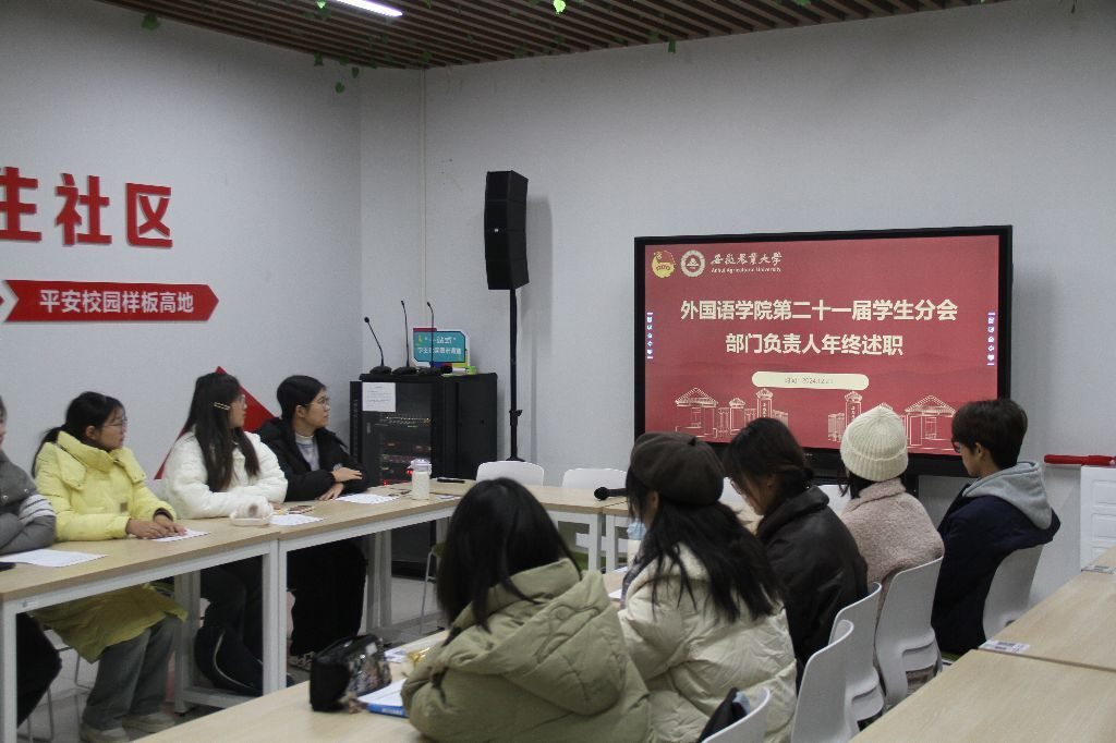 本网讯 12月23日晚19:00,外国语学院学生分会在校外公寓一站式服务中心组织开展述职评议大会。外国语学院团委老师、外国语学院学生分会主席团成员和各部门主要负责人参与了述职培训会。