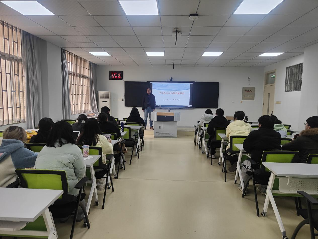 本网讯 12月27日下午,我校人文社会科学学院院长方国武教授受邀在外国语学院209教室为我院日语系师生带来了一场题为“中日农业文化遗产的价值相通性”的精彩讲座。本次讲座不仅激发了日语系师生对农业文化的研究兴趣,拓展了他们跨学科研究的视野,同时也标志着2024年度“亚洲命运共同体”系列学术讲座圆满落幕。