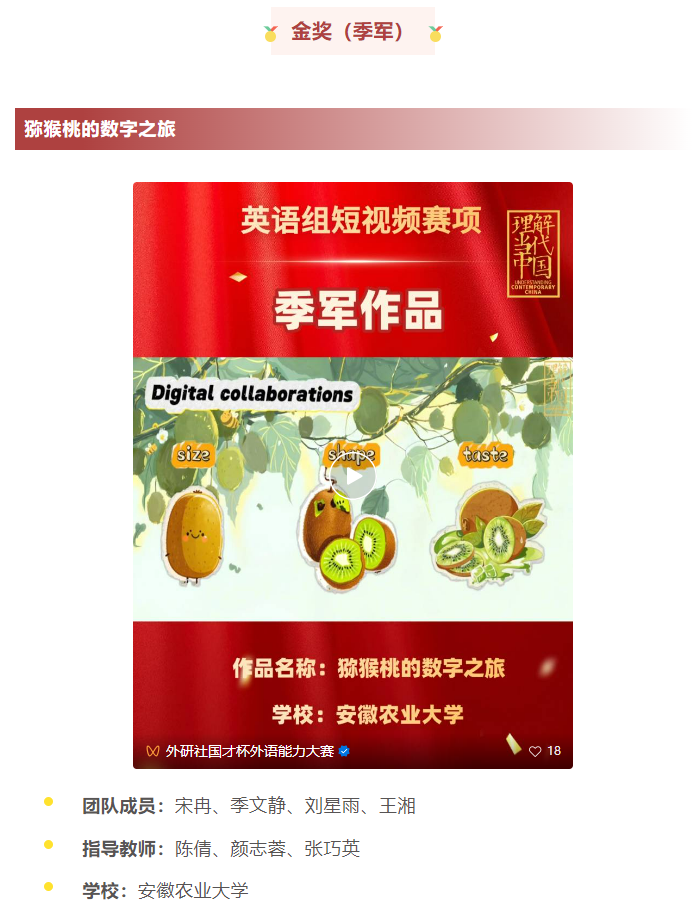 在短视频赛项中,指导教师陈倩、颜志蓉、张巧英深入探索及精准把握了大赛主题“数字中国”,从构思定题、脚本撰写到视频制作的全过程都进行了细致的指导,最终,在几位老师的悉心指导下,英语系宋冉同学团队制作的短视频《猕猴桃的数字之旅》在446个国赛入围作品中脱颖而出,荣获金奖季军,刷新了我校在该赛事的历史最好成绩。