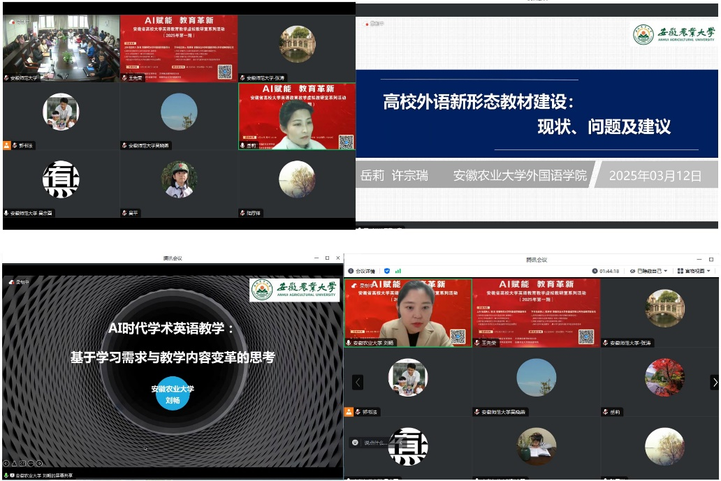 本网讯 3月12日,我院与安徽师范大学外国语学院云端联动,携手开展安徽省高校大学英语教育教学虚拟教研室活动。活动由安徽师范大学外国语学院副院长张涛和安徽农业大学外国语学院公共外语教学部主任陆厚祥共同主持。安徽省外国语言文学学会副会长、大学英语教学研究分会会长、安庆师范大学外国语学院王先荣教授致开幕词。安徽省外国语言文学学会大学英语教学研究分会秘书长、蚌埠医科大学公共基础学院郭书法教授做总结点评。