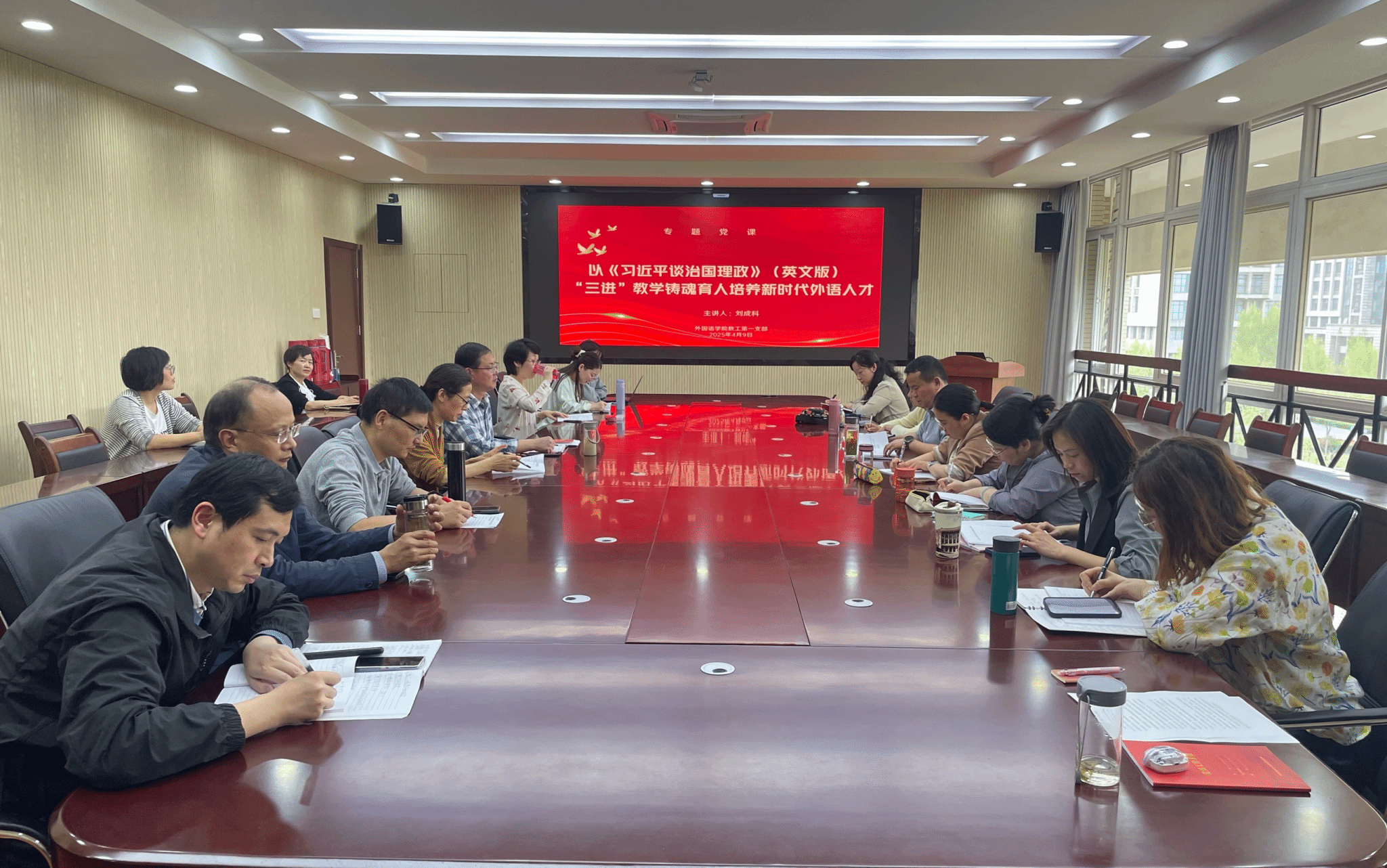 会议指出,《习近平谈治国理政》作为系统反映习近平新时代中国特色社会主义思想的权威读本,其多语种版本既是我国政治话语外译范文,也为高校外语课程思政提供了思想宝库。各位党员要深刻认识到“三进”工作的重要意义,坚持以“三进”工作为引领夯实育人根基;聚焦“三进”教学的指导思想、实施路径以及课程设计等内容,强调应以“三进”教学为契机重塑外语人才培养范式,培养能讲好中国故事、传播好中国声音的新时代外语人才。(图文/陈倩 编辑/彭倩 预审/姬惠惠 审核/何如海)