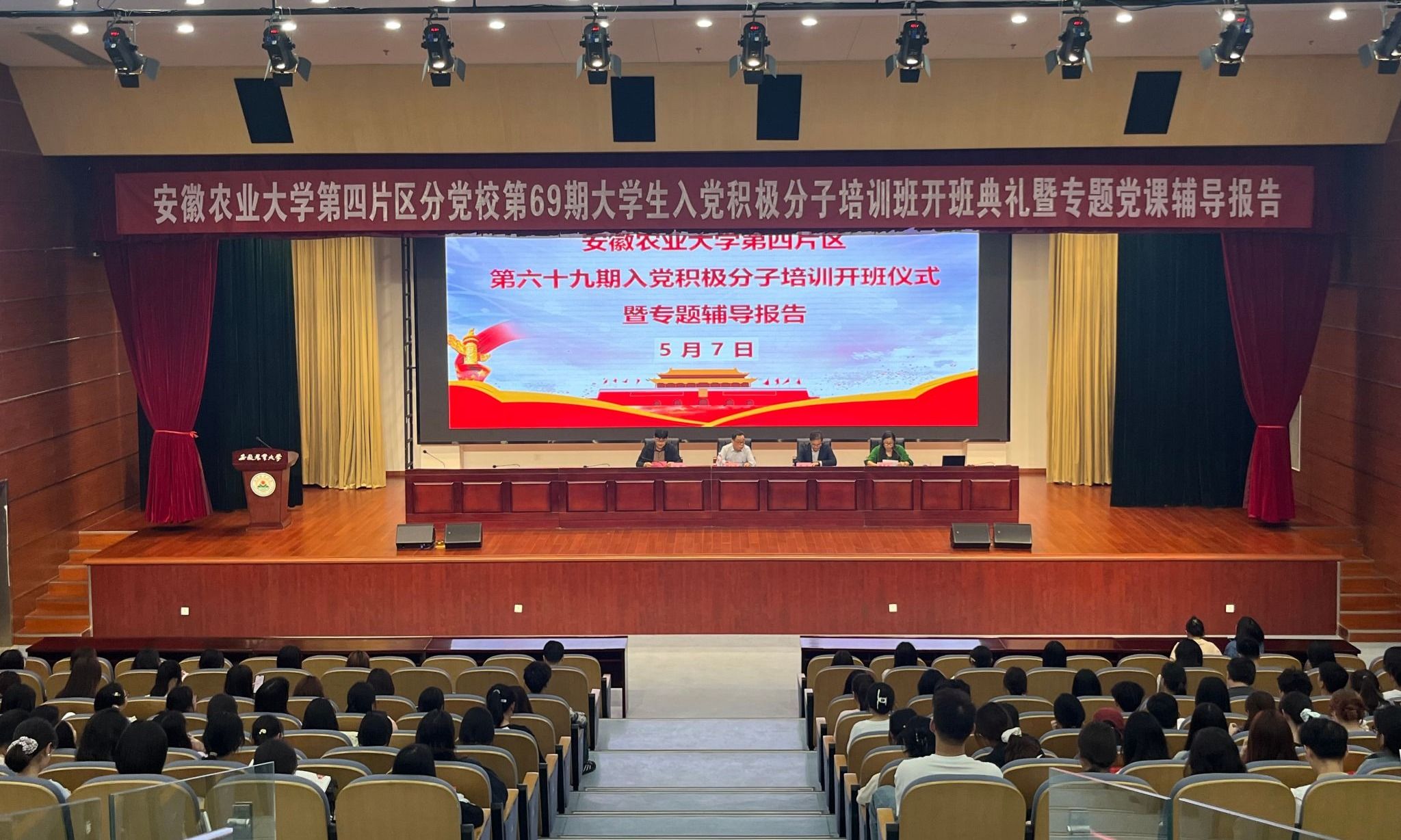 本网讯 5月7日晚,校第四片区分党校第69期入党积极分子培训班开班典礼在图书馆第一报告厅举行。外国语学院党委书记何如海,经济管理学院党委副书记、纪委书记周涛,人文社会科学学院党委副书记、纪委书记孙辉出席,开班典礼由外国语学院党委副书记、纪委书记姬惠惠主持。