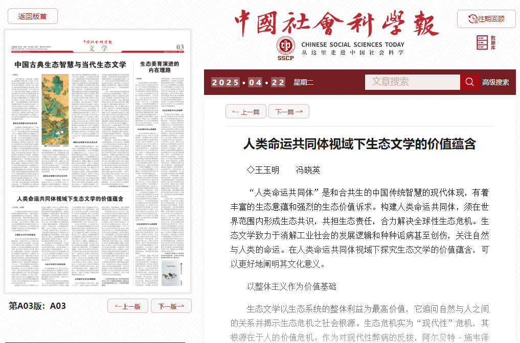 本网讯 4月22日,我校区域国别研究中心主任、外国语学院王玉明教授在《中国社会科学报》发表了题为“人类命运共同体视域下生态文学的价值蕴含”的理论文章,外国语学院冯晓英副教授为文章的共同作者。该文已被《中国社会科学文库》全文收录,被《北京日报》《安徽日报》等全文转载。