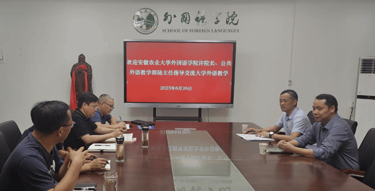 本网讯 6月26日下午,外国语学院副院长许宗瑞一行赴淮南师范学院外国语学院交流我校大学外语教育教学工作。交流活动由淮南师范学院外国语学院院长丁立福主持,淮南师范学院外国语学院党委书记阳国华、大学外语教学部主任和骨干教师参与了此次交流。