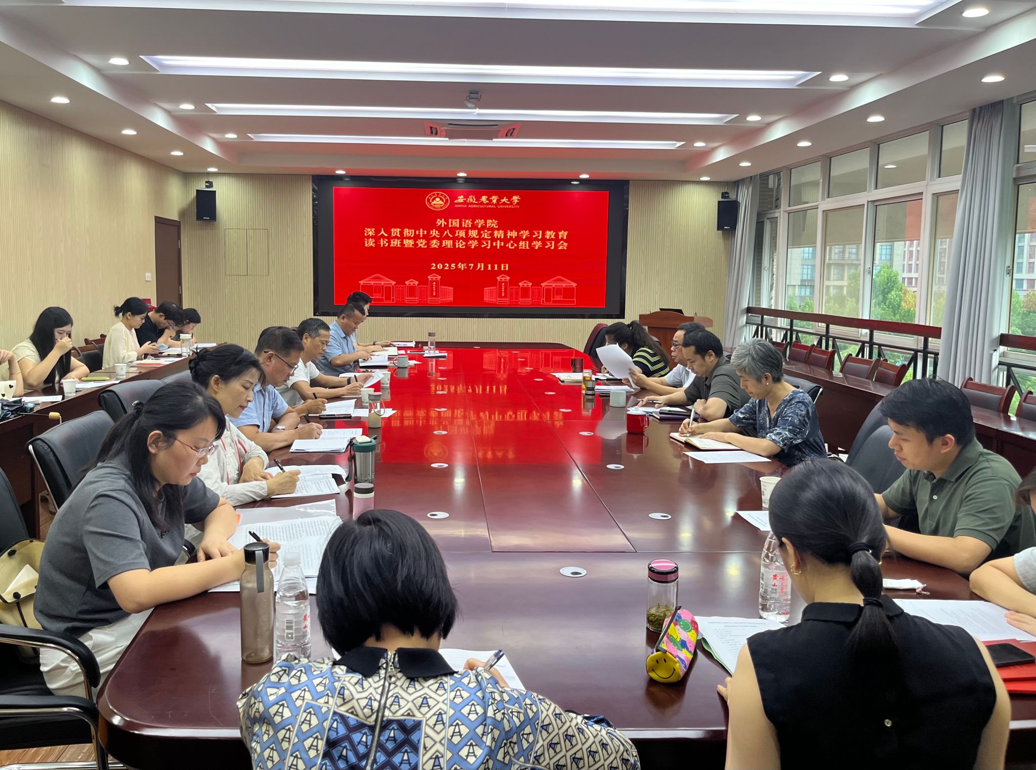 本网讯 7月11日下午,外国语学院召开深入贯彻中央八项规定精神学习教育读书班(第五期)暨党委理论学习中心组学习(扩大)会。学院党政领导、党委理论学习中心组成员、党支部书记、副书记及支委委员参会。会议由学院党委书记何如海主持。