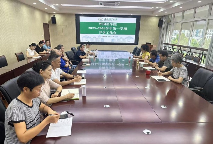本网讯 8月25日下午,外国语学院在外语楼506会议室召开2025-2026学年第一学期开学工作会议。学院领导许宗瑞、姬惠惠、张文静,系(部)主任、党支部书记、教学管理人员、辅导员以及实验中心负责人员参加会议。会议由学院党委书记何如海主持。