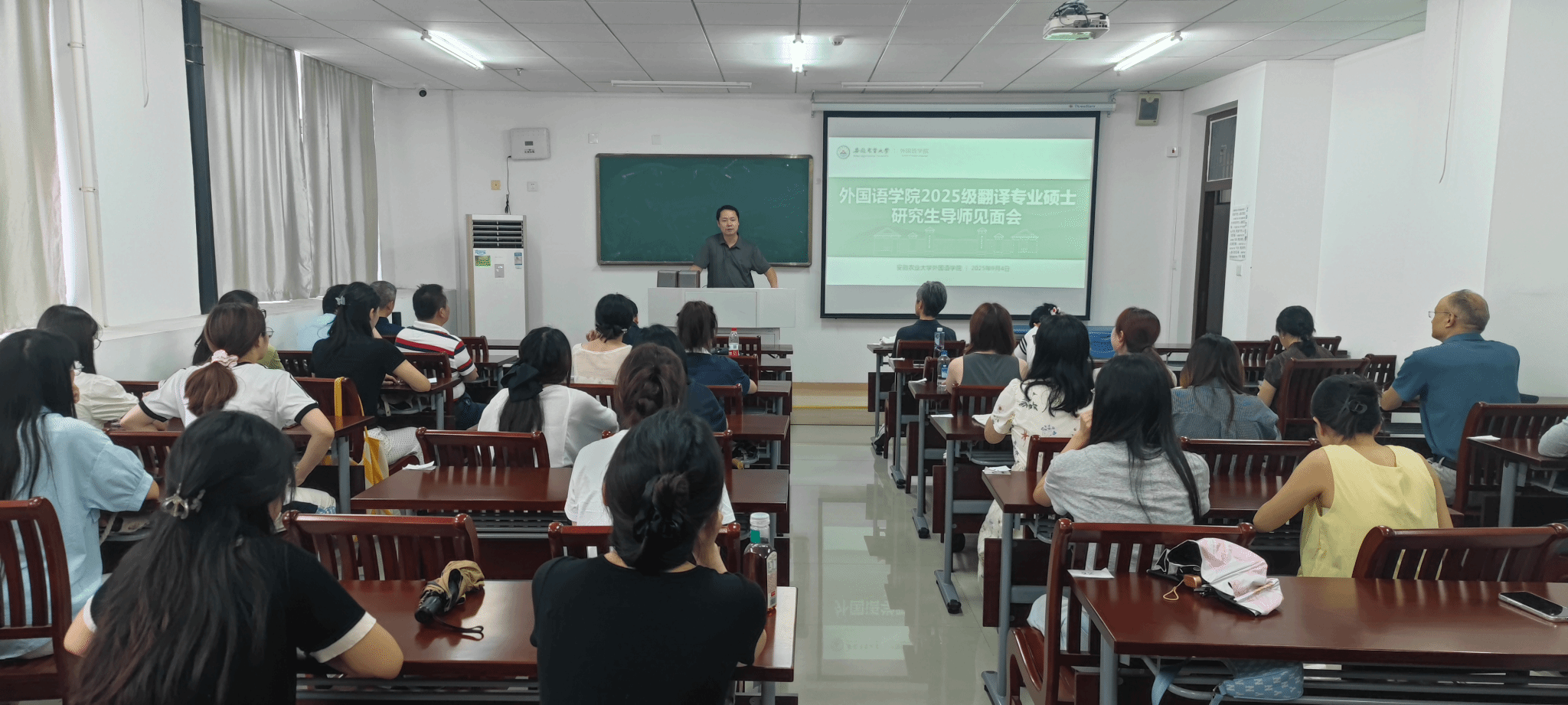 本网讯 2025年9月4日下午,外国语学院2025级翻译硕士研究生导师见面会在安徽农业大学九华山路校区二号楼F205教室举行。学院副院长许宗瑞、副院长张文静、全体研究生导师、教学秘书及2025级全体翻译硕士研究生参加会议。会议由学科负责人刘成科主持。