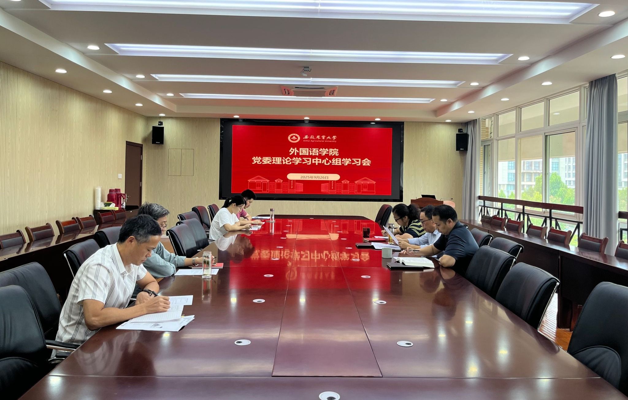 本网讯 9月26日下午,外国语学院召开党委理论学习中心组学习会。学院党委理论学习中心组成员、党支部书记参加会议。会议由学院党委书记何如海主持。