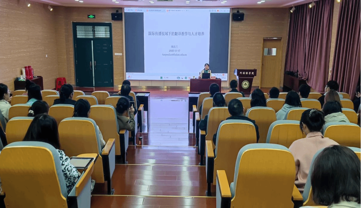 本网讯 11月17日上午,复旦大学陶友兰教授来学院做题为“国际传播视域下的翻译教学与人才培养”的讲座。讲座由翻译硕士学位点负责人、英语系主任刘成科主持,学院副院长许宗瑞、全体教师及翻译硕士研究生等参加。