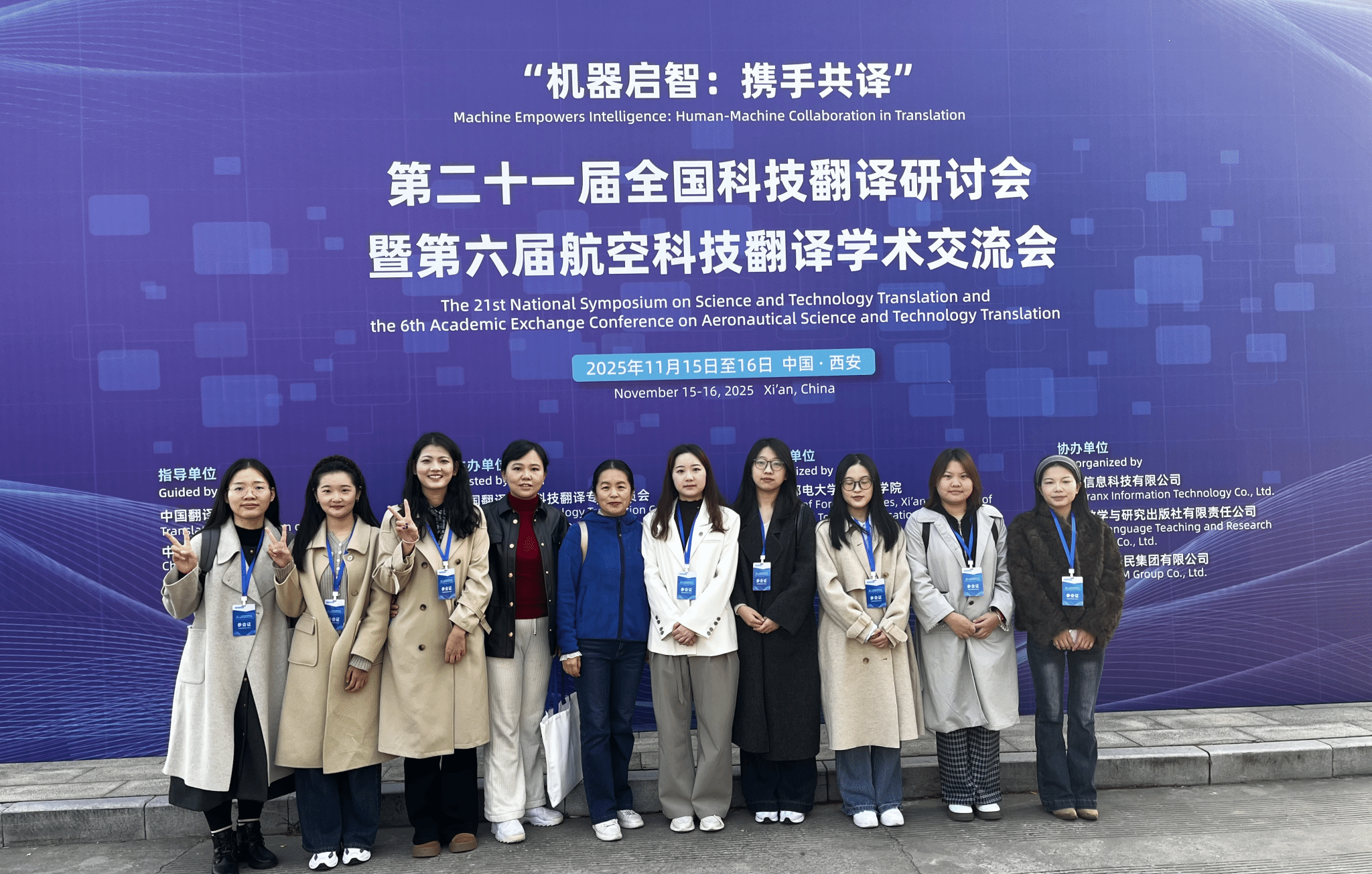 本届大会以“机器启智:携手共译”为主题,聚焦人工智能推动下的语言技术变革及航空等专业领域的实践需求,围绕智能时代科技翻译的理论前沿、标准建设与人才培养展开研讨。期间,裴斐副教授和8位研究生在分论坛上宣读了论文。