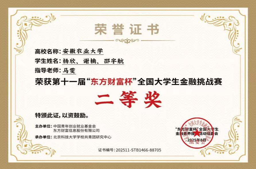 本网讯 近日,第十一届“东方财富杯”全国大学生金融挑战赛全国总决赛圆满落幕。外国语学院英语系24级英语专业杨欣团队,凭借扎实的专业功底与良好的团队协作精神,在比赛中荣获国家级二等奖。