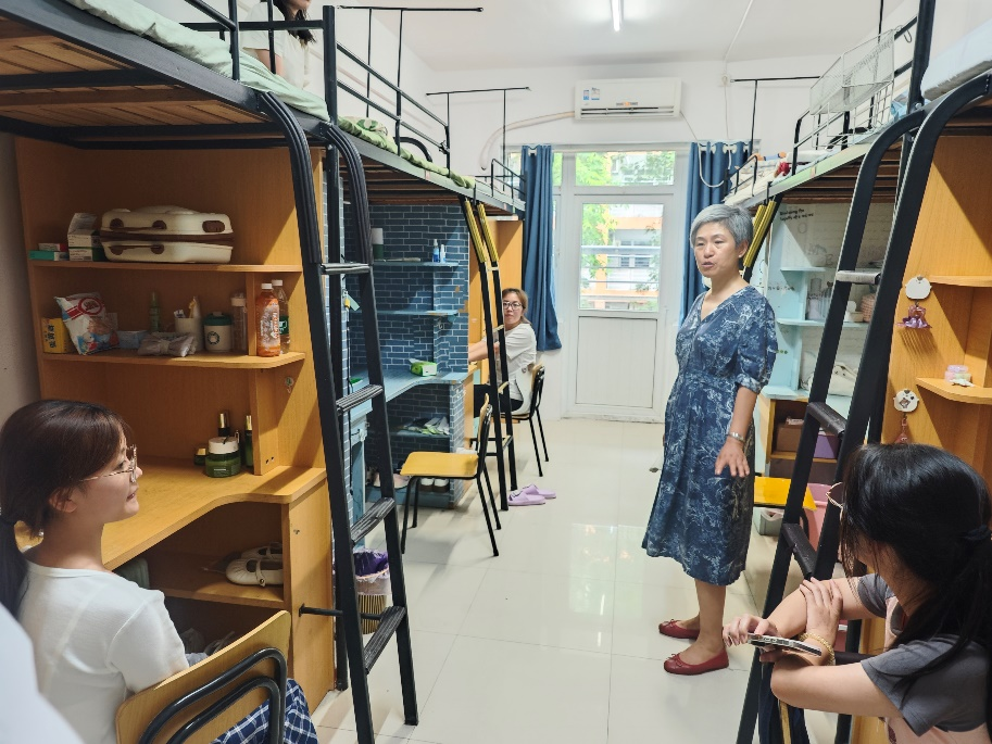 走访宿舍,传递温情。傍晚,学院领导和老师一行走访新生宿舍,深入了解学生的入住情况。领导们与新生亲切交谈,细致询问生活需求,并叮嘱大家注意安全、互帮互助,尽快适应大学集体生活。一句句暖心话语让新生感受到了外国语学院细致的人文关怀。