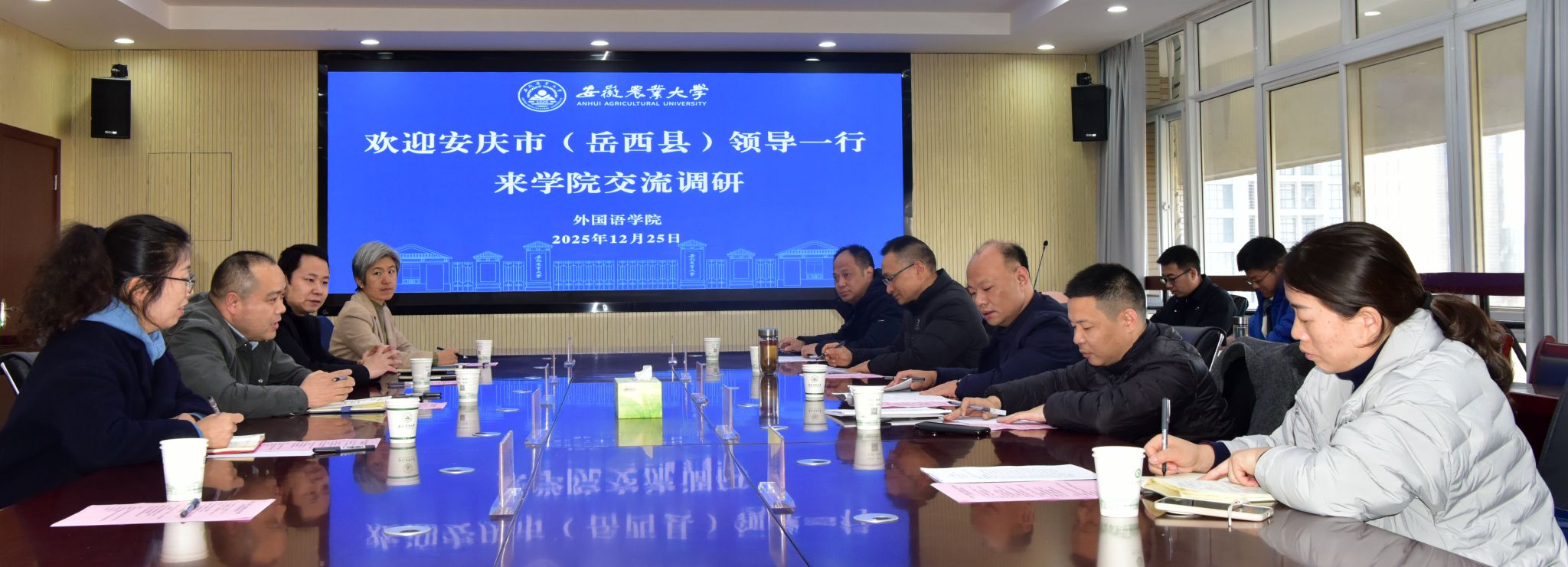 本网讯 2025年12月25日,安庆市委人才工作局副局长叶超、岳西县委常委、组织部部长吴姚政一行到访我院,双方就乡村振兴人才培养工作进行了交流座谈。会议由外国语学院副院长许宗瑞主持,校新农村发展研究院副院长单国雷及学院部分领导参加了座谈会。