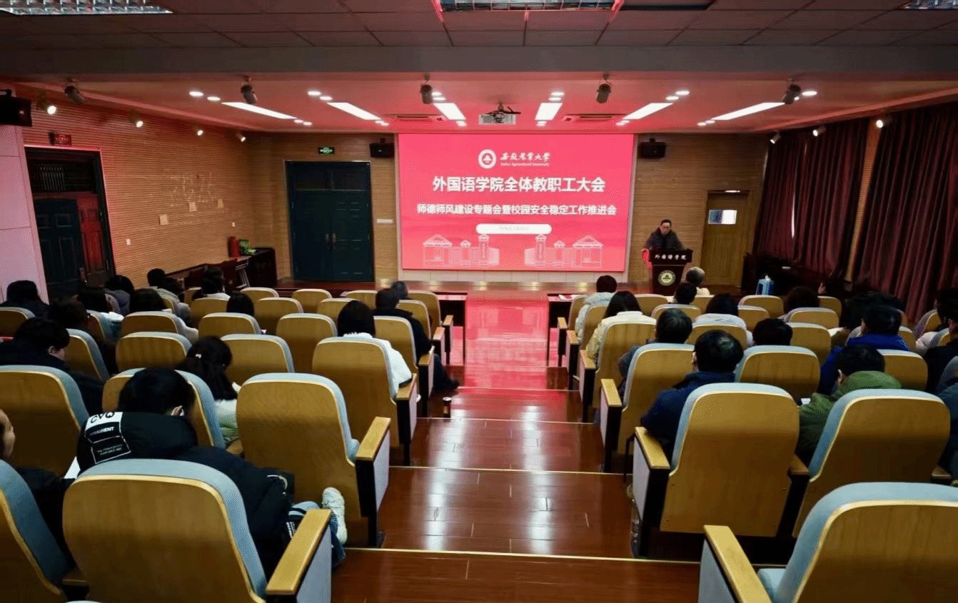 本网讯 1月23日下午,外国语学院在外语楼502多功能报告厅举行全体教职工大会,专题部署师德师风建设和校园安全稳定工作。学院副院长许宗瑞、张文静和全体教职员工参加了会议。会议由学院党委书记何如海主持。