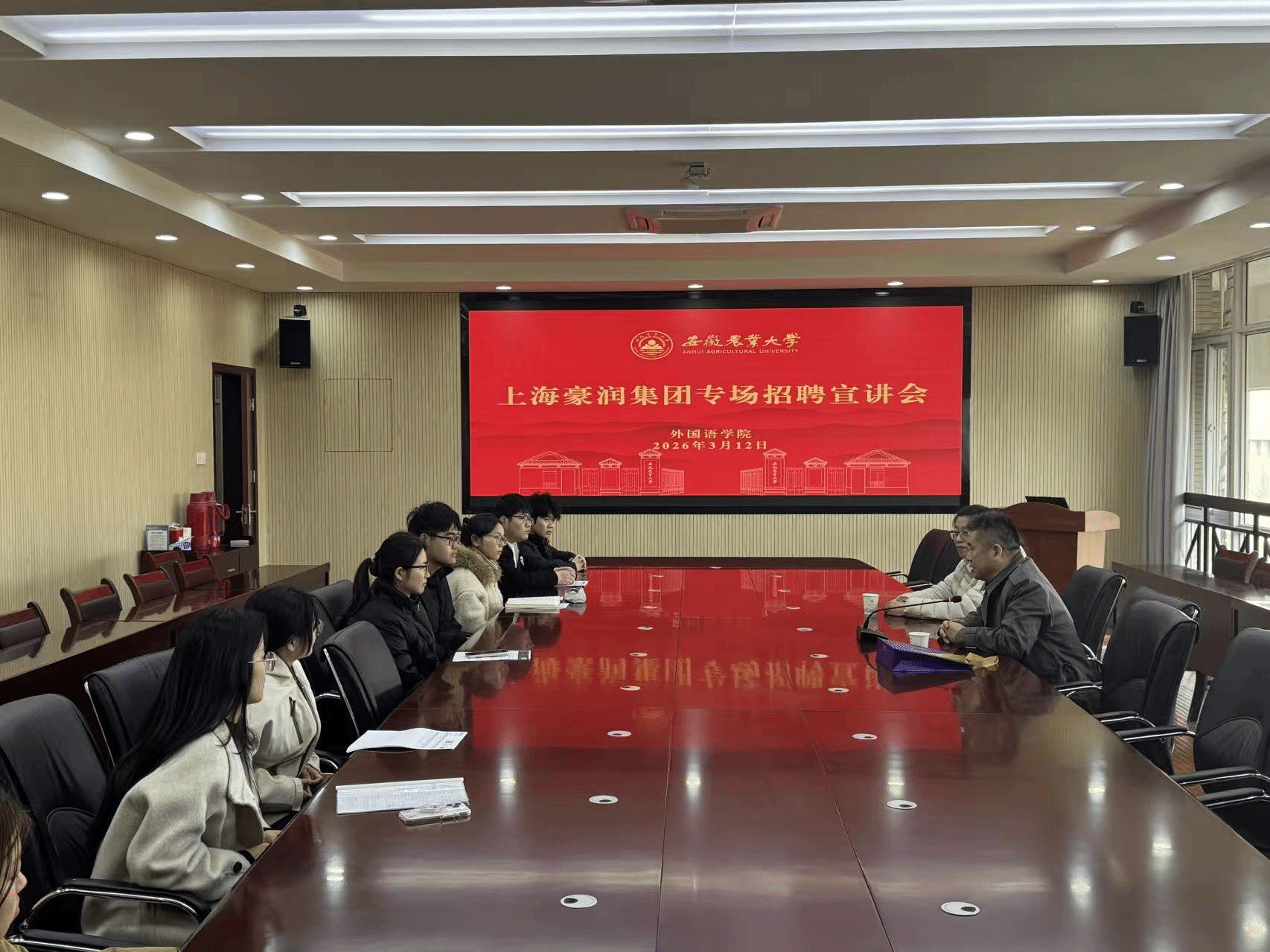 本网讯 3月12日上午,外国语学院在外语楼506会议室举办校友企业专场宣讲会。上海豪润集团有限公司总经理程金付(1994届农学专业校友)、2026届部分毕业生等参加了宣讲会,宣讲会由外国语学院党委副书记姬惠惠主持。