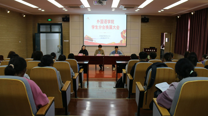 本网讯 为进一步加强学院学生骨干队伍建设,充分发挥学生骨干“自我教育、自我管理、自我服务、自我监督”的作用。10月13日,外国语学院在外语楼502报告厅举行第十八届学生分会换届大会。院党委副书记姬惠惠、院团委老师葛德智、殷霞、第十七届学生分会学生骨干、第十八届学生分会全体成员出席本次大会。大会由院团委负责老师殷霞主持。
