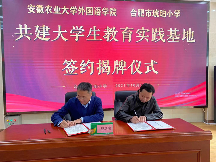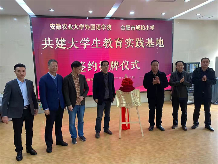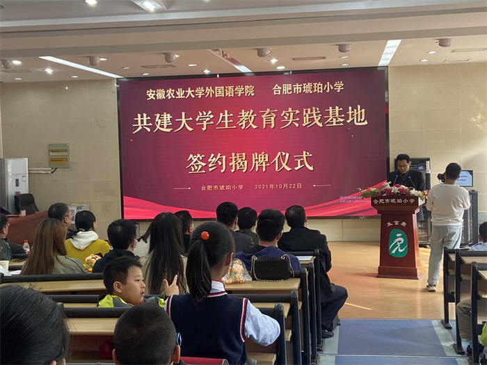 本网讯10月22日,外国语学院与合肥市琥珀小学共建大学生教育实践基地揭牌仪式在琥珀小学东区阶梯教室举行。校教务处副处长李玮和琥珀小学书记彭玉柱为教育实践基地揭牌。外国语学院副院长许宗瑞、日语系主任王磊、法语系主任倪复生、院办公室老师殷霞、琥珀小学校长徐诗友、副校长杨维、主任戴超等参加。揭牌仪式由琥小老师钱坤主持。