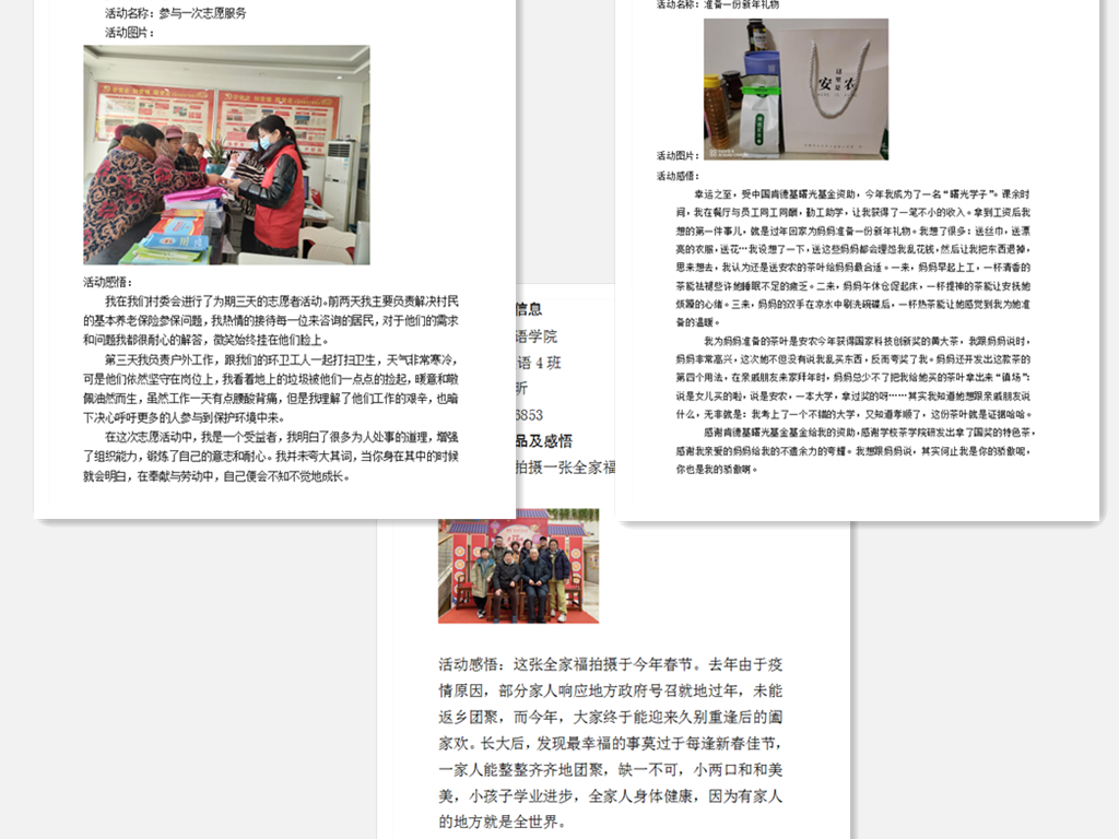 学院围绕感恩、励志、奉献等主题,号召全体获奖受助学生利用假期,结合自身实际,从“参与一次志愿服务、开展一场资助政策宣讲、准备一份新年礼物、拍摄一张全家福、与父母谈一次心、观看一部红色影片、阅读一本经典好书”这七个活动中选择适合自己的项目参与并撰写活动体验和感悟。