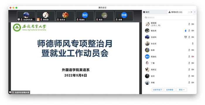 本网讯 为落实学院“师德师风专项整治月”及本科毕业生就业工作部署,5月6日晚英语系通过腾讯会议的方式开展了师德师风专项学习活动暨就业工作动员会,外国语学院院长孙志农参加会议。活动由英语系主任刘成科主持,英语系全体教师云端参会。