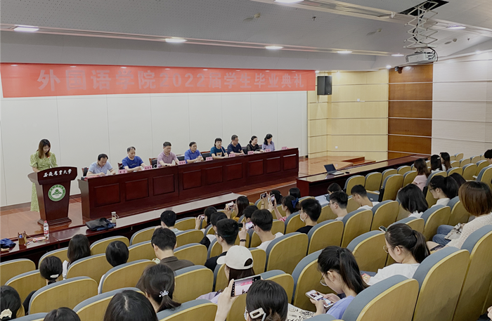 方章东书记代表学院作毕业致辞,对圆满完成学业,即将踏上新征程的毕业生致以衷心的祝贺,并勉励毕业生要保持良好心态,涵育高尚修养,以昂扬向上的正能量,乐观对待困难和挑战;要持之以恒,坚定执着,以扎实勤恳的优良作风,成就一番事业;要坚定道路自信、理论自信、制度自信、文化自信,做到“心中有信仰,脚下有力量”,要把对党和国家的信心、对自己的信心,化为实实在在的拼搏动力,在自己的岗位上做出切实的贡献。法语系夏梦作为教师代表发言,她鼓励毕业生要留住终身学习的决心、坚守梦想的初心、与人为善的爱心,努力做一个自信自立的人;一个爱岗敬业、奋发有为的人;一个立德修身、公道正直的人。毕业生代表汪莹同学在她的发言中深切地表达了她对外院的不舍、对老师们的感激以及对安农的美好祝愿。