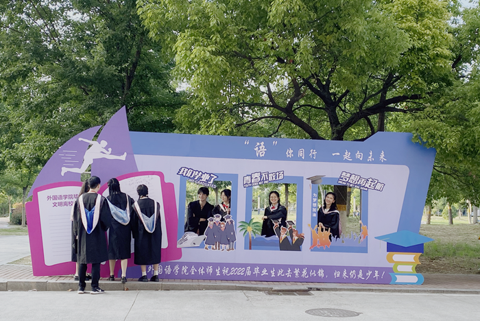 毕业前夕,外国语学院为每位2022届毕业生准备了精美的个人签名印章作为毕业纪念品。纪念印章由水晶材质定制而成,内嵌安徽农业大学校徽和“外国语学院2022年毕业纪念”等字样,富有纪念意义和收藏价值,深受毕业生喜爱。学院还制作了主题为“‘语’你同行 一起向未来”的文明离校纪念签名墙,供毕业生合影留念。