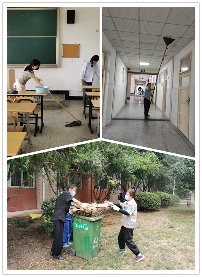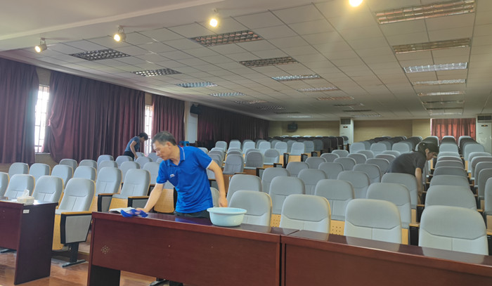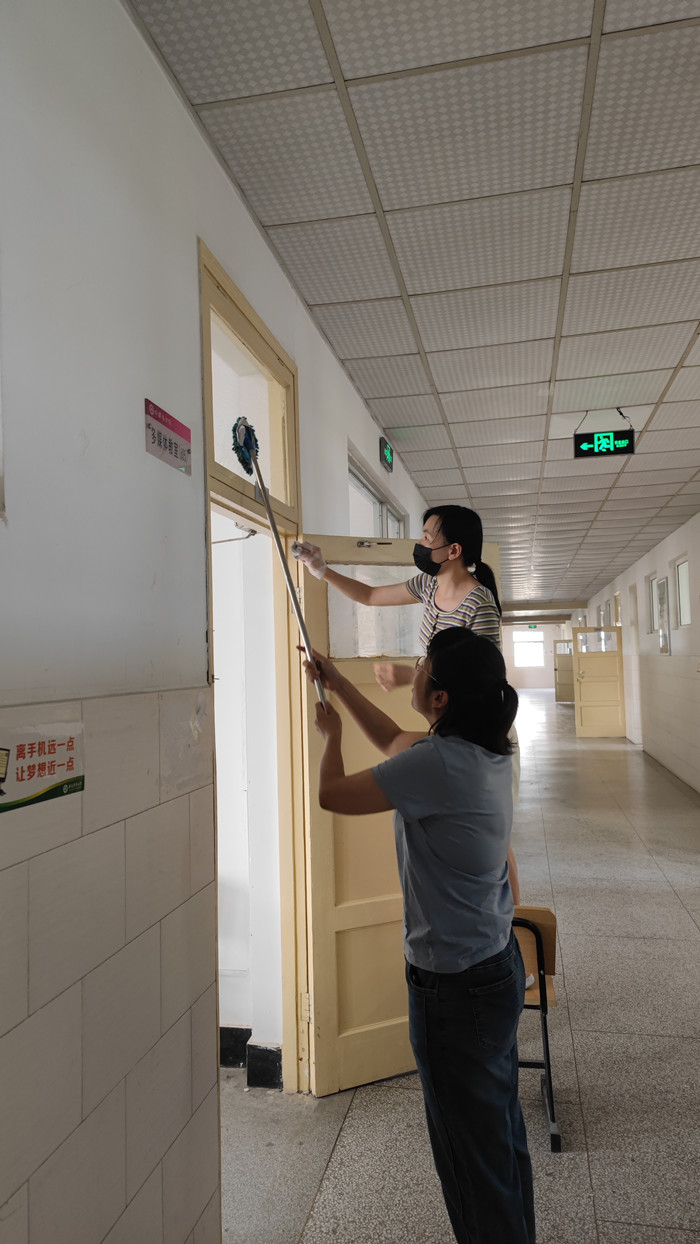 7月19日,160名在校师生分为5大组,60小组分布在学院各个角落集中清理了学院一楼至六楼共62间教室300余扇门窗,清除不当墙面粘贴、卫生死角内堆积的杂物等。7月20日上午对照校园环境综合整治验收标准对室内和室外再次进行清理,做到学院环境干净整洁、温馨舒适。