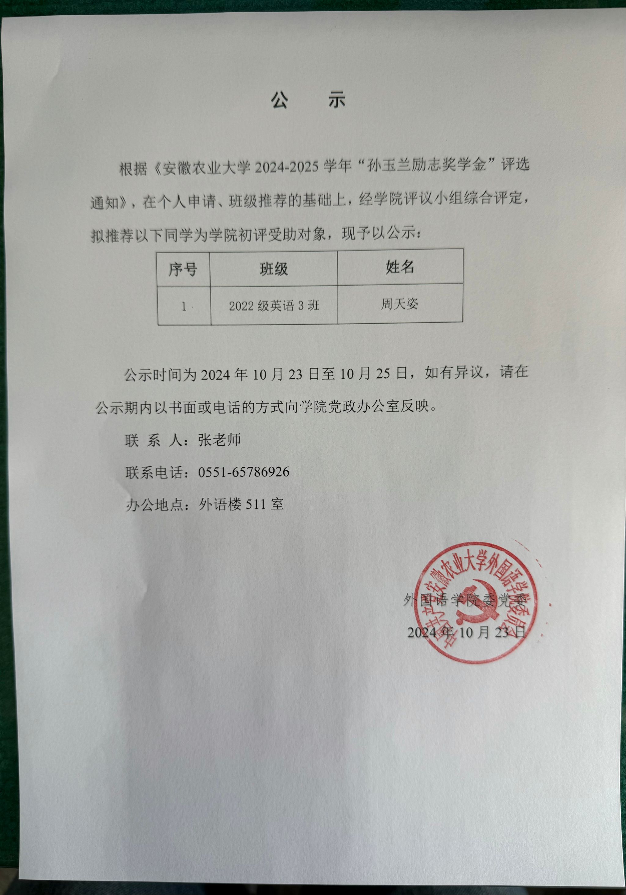 外国语学院2024-2025学年“孙玉兰励志奖学金”推荐名单公示