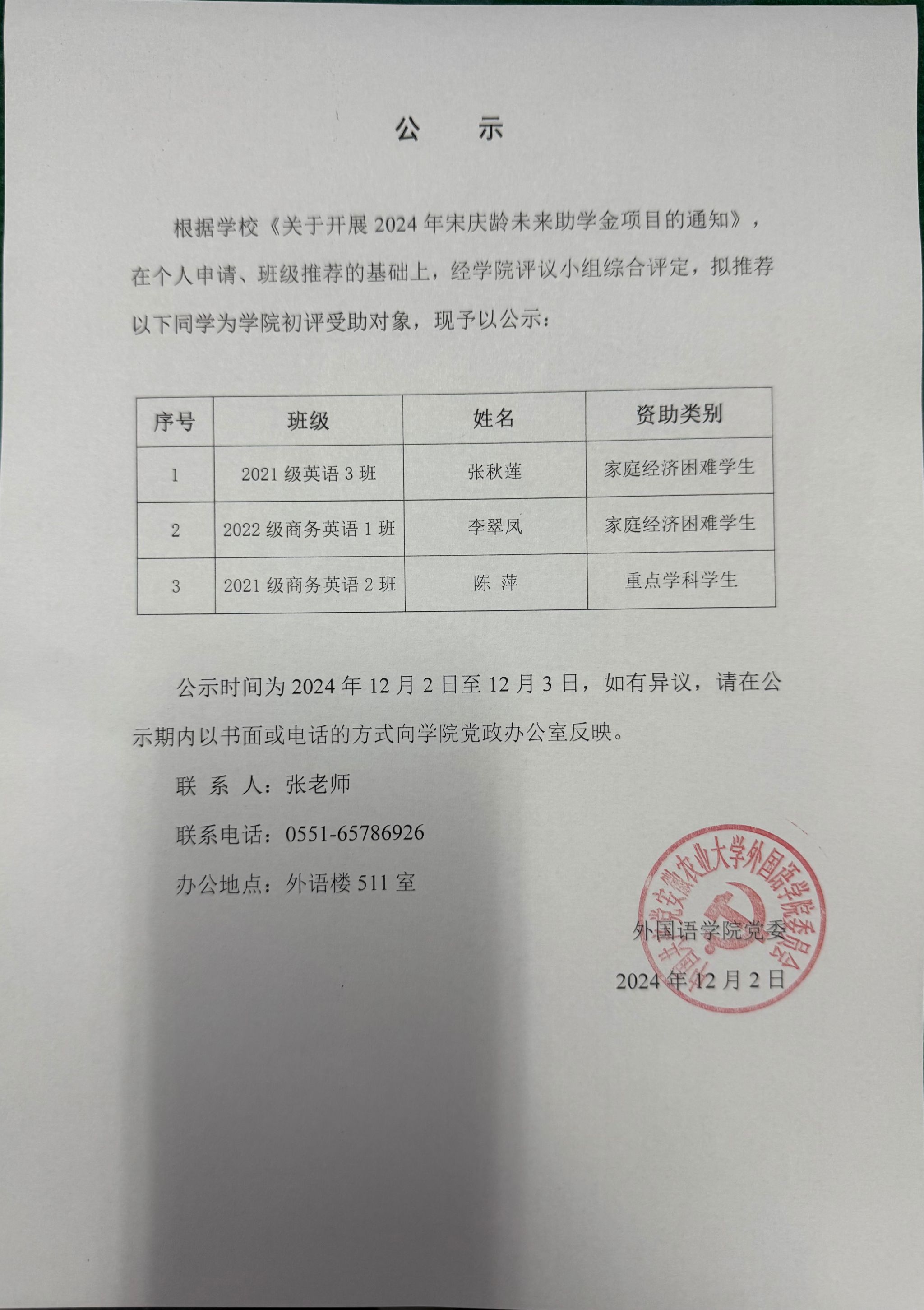 公示 外国语学院2024年宋庆龄未来助学金项目推荐名单