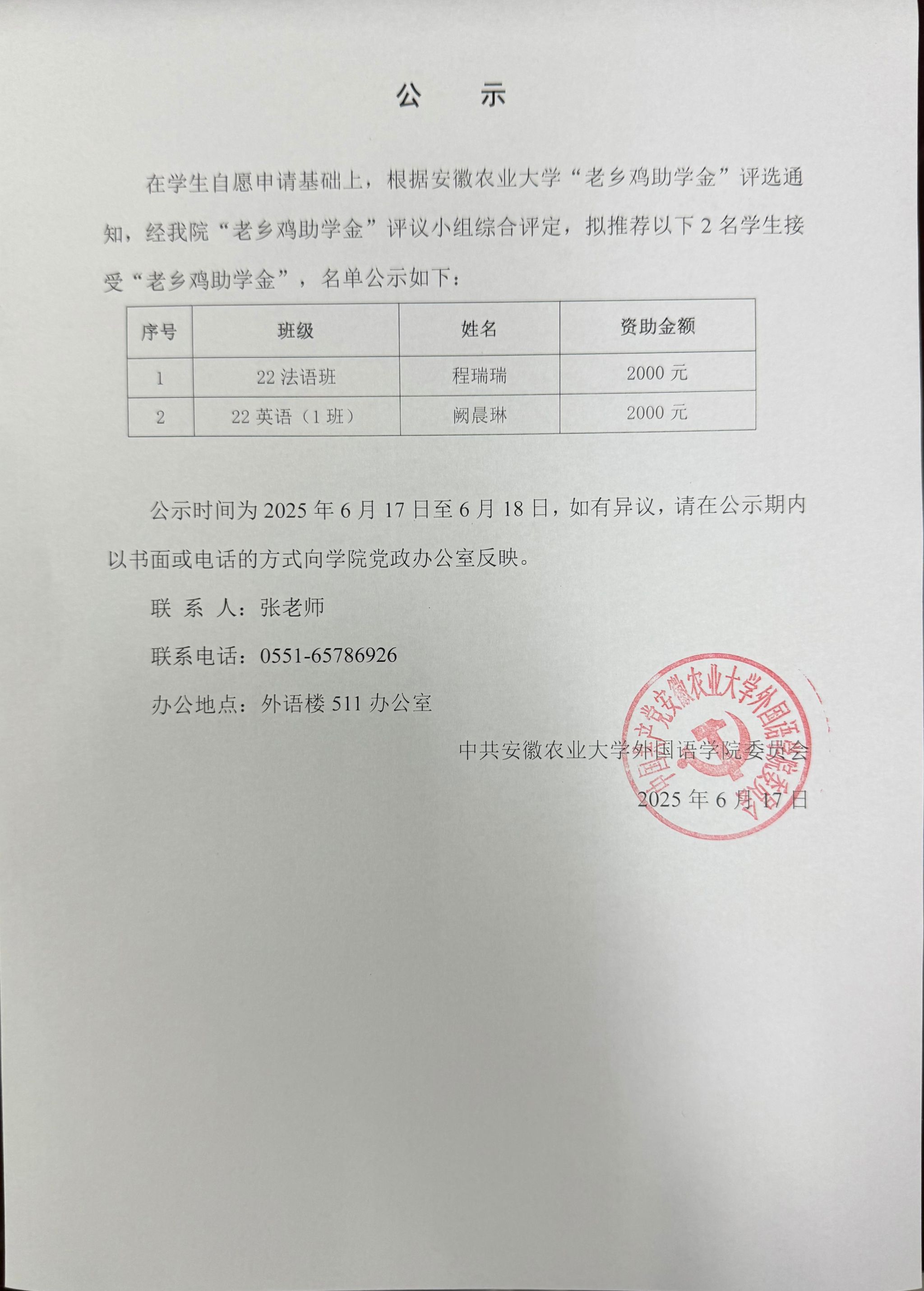 外国语学院“老乡鸡助学金”公示